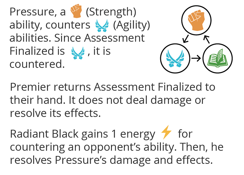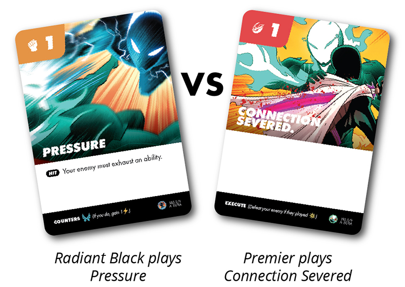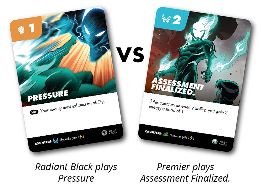 • If your card counters the symbol in the top left of your opponent’s card, you gain 1 energy , they return their card to hand and it has no effect.