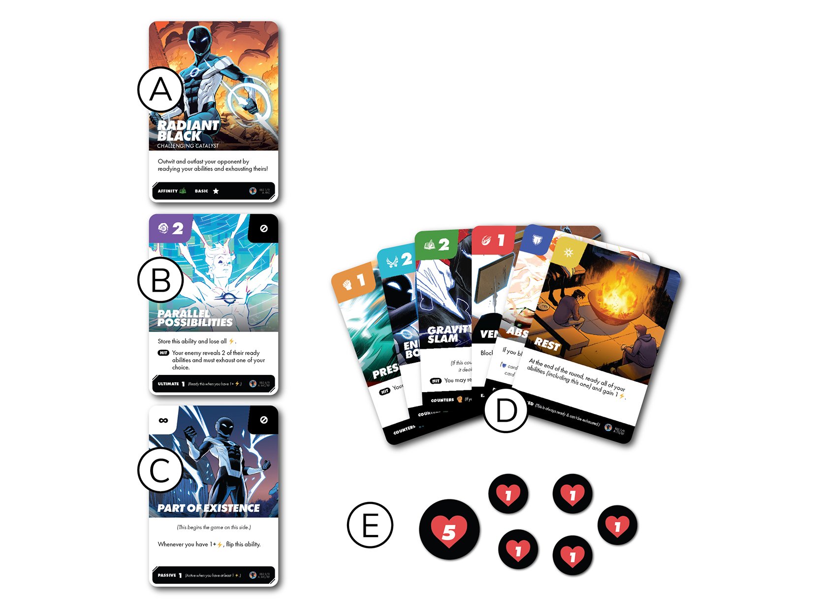 • Place your character’s portrait card (A), ultimate (B), and passive ♾️ (C) face up on the table. They start on the side with the floating bottom bar.