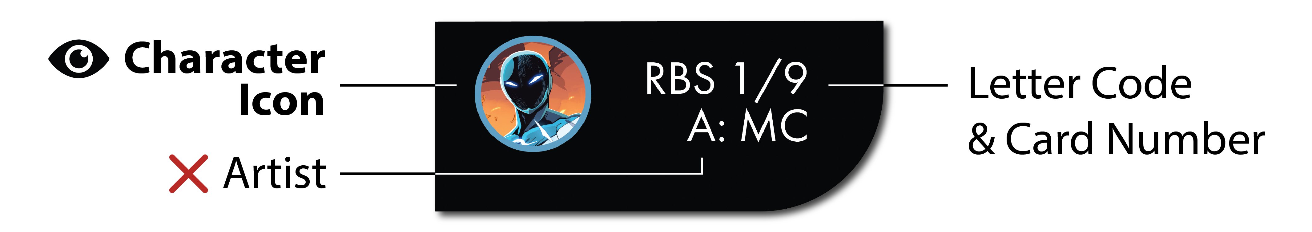 Your character’s cards have a small version of their portrait in the bottom right corner and a letter code that is consistent across their cards (RBS for Radiant Black, PRS for Premier).