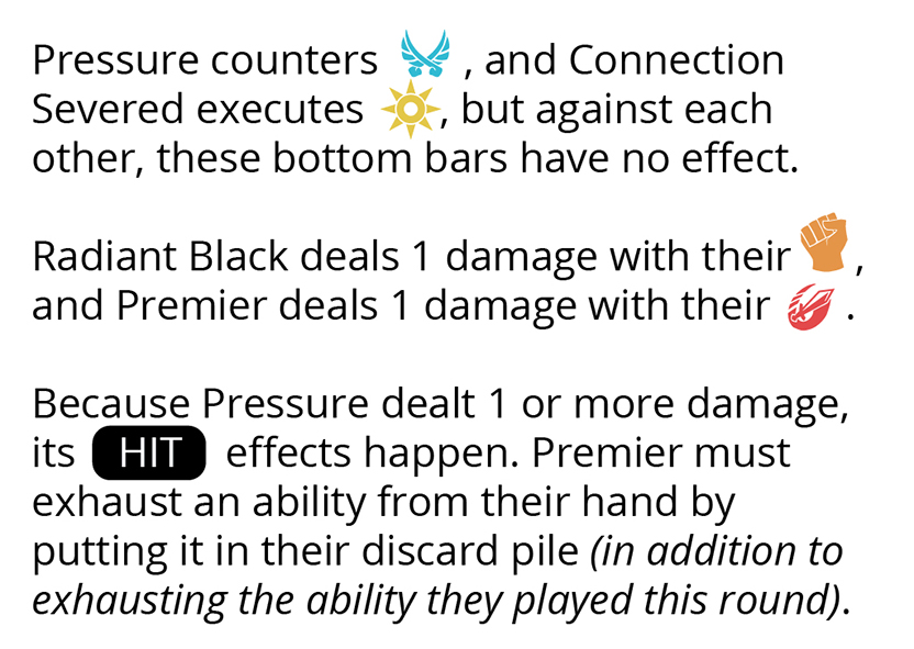 Both players choose a card in their hand and place it face-down. After both players have selected their ability, turn the cards face up.